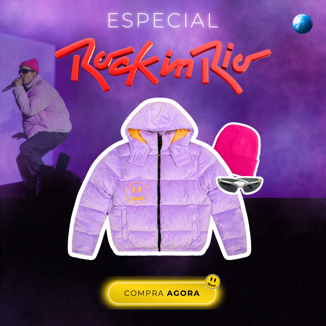Jaqueta Puffer "Lavender" Drew House usada por Justin Bieber em sua vinda ao Rock in Rio 2022.
